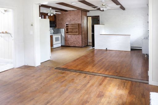 Living spaces are finished with hardsurface flooring, radiator heat, and ceiling fans, creating comfortable and usable areas throughout the home.
