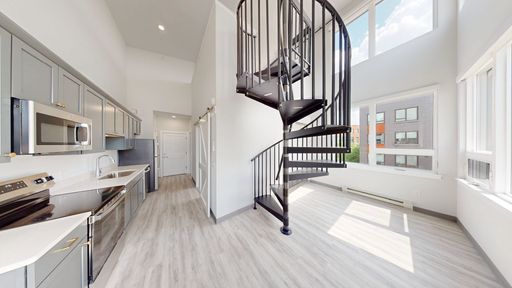 This one-of-a-kind two-bedroom apartment with a lofted den offers a dramatic, light-filled living experience unlike anything else in Winooski. An additional office space provides multiple living options and extra room.