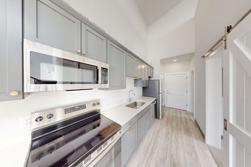 The open-concept main level seamlessly connects the kitchen, dining, and living areas, enhanced by expansive windows, natural light, and city views. The modern kitchen is thoughtfully designed with matching stainless steel appliances, stone countertops, an apron sink, and a built-in microwave, complemented by designer pendant lighting, recessed lighting, and hard-surface flooring throughout. An in-unit washer and dryer, energy-efficient heat pump, and air conditioning provide year-round comfort and convenience.