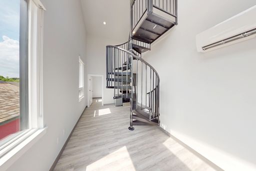 A striking spiral staircase leads to the elevated den, creating a flexible space ideal for a home office, reading nook, or additional lounge area, while adding architectural character and visual interest to the home.