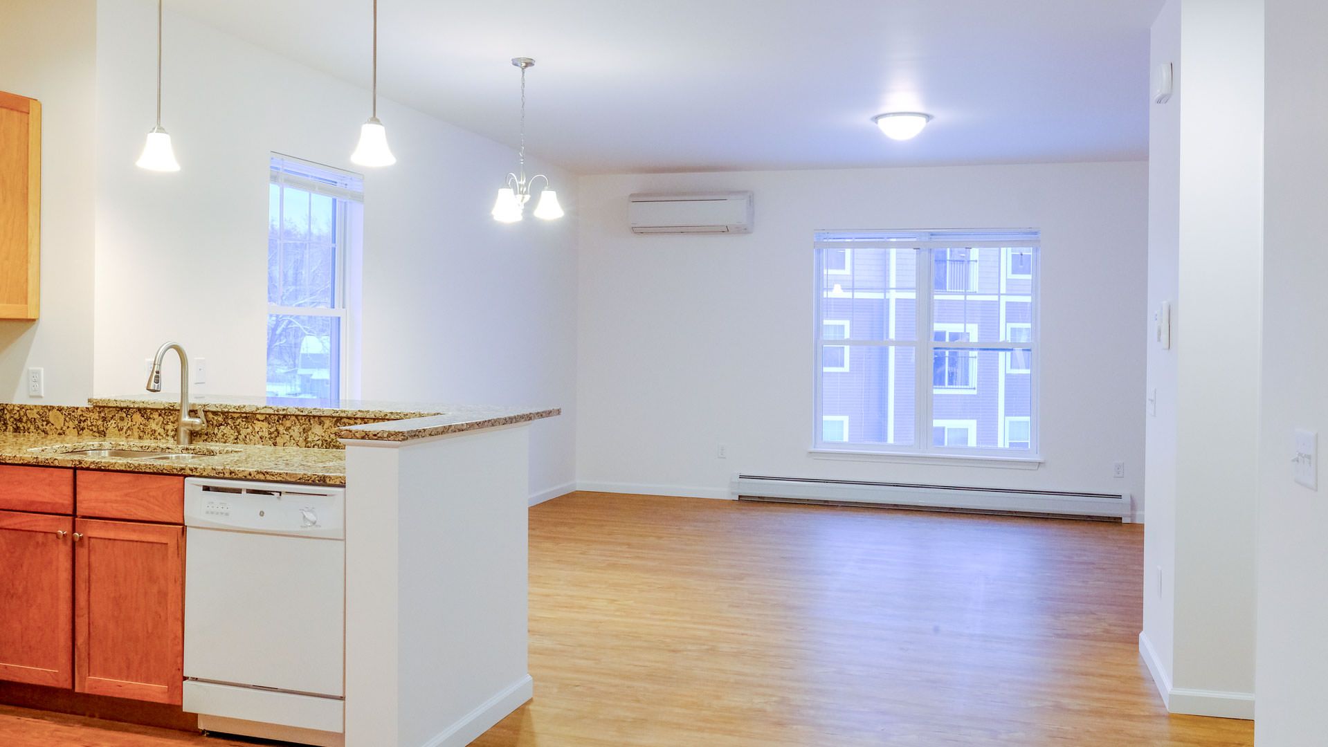 First floor apartments include radiant in floor heat (tenant pays heat). Newer build apartment community. Each apartment includes matching appliances — including a dishwasher — granite countertops, soft close cabinetry, and air conditioning via resident controlled, energy efficient heat pumps.